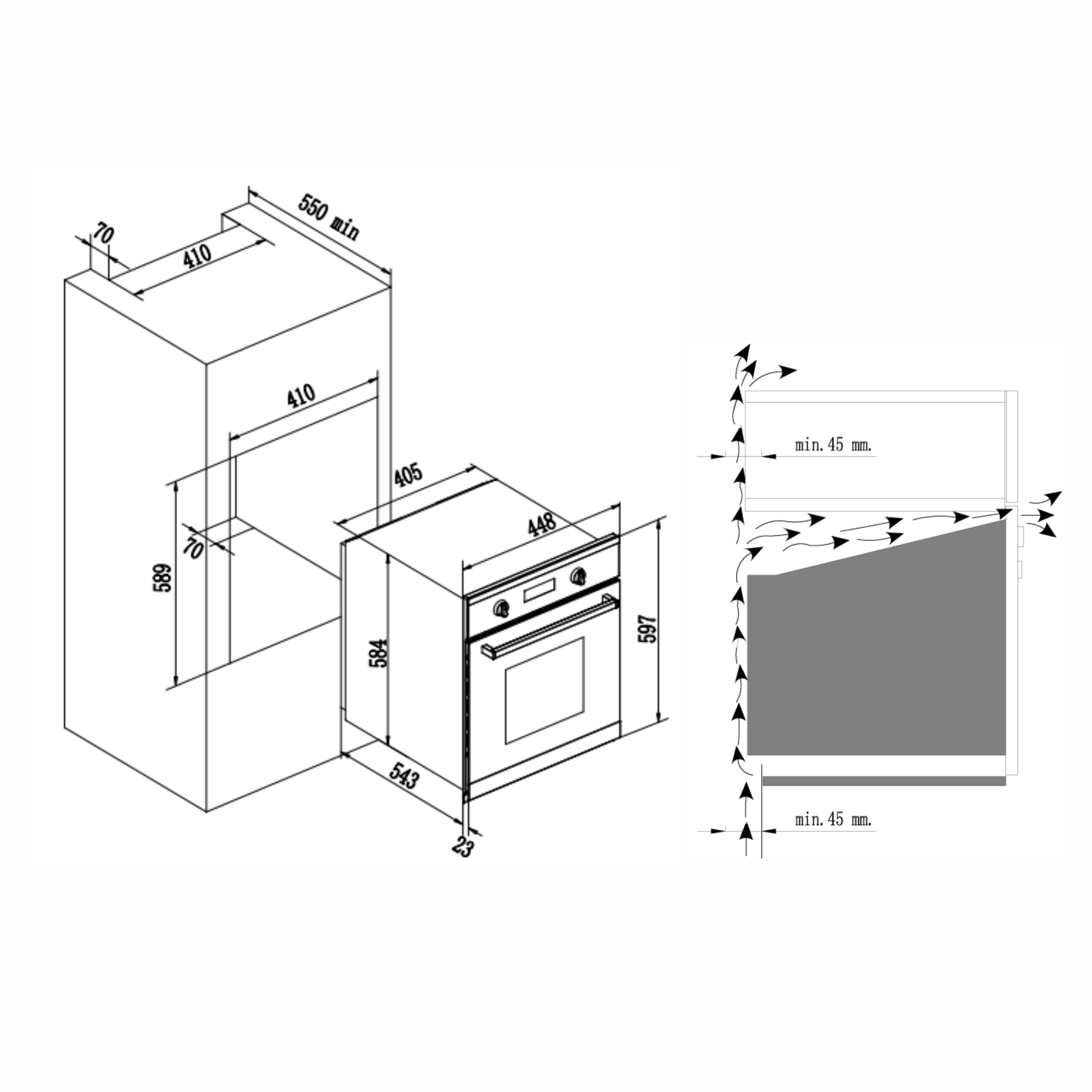 Максимальна температура духової шафи досягає 250°С, тому система тангенціального охолодження не дозволить корпусу духовки нагрітися вище 60°С, що гарантує збереження кухонних меблів.