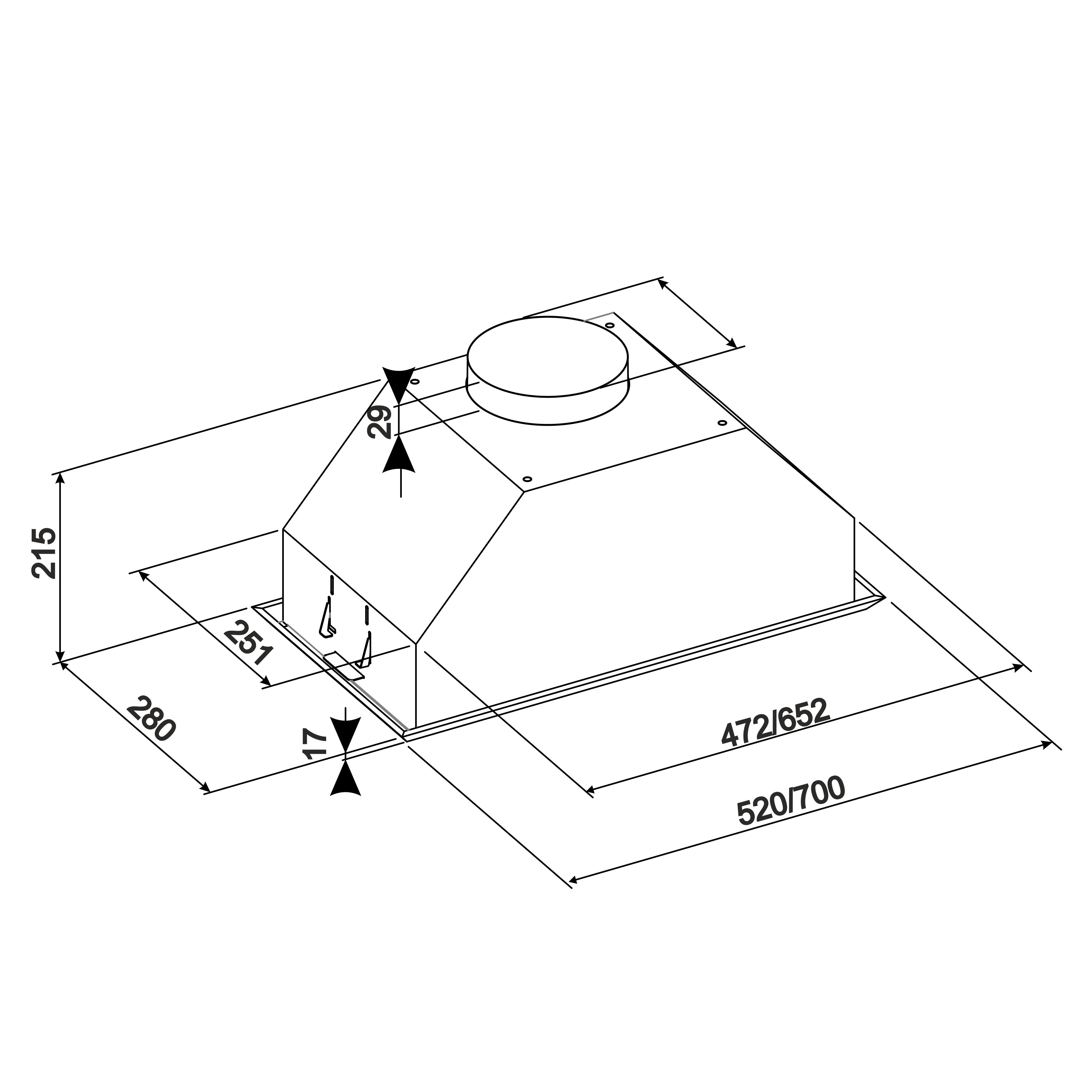 Комплект постачання | Вытяжка кухонная, Руководство по эксплуатации, Гарантийный талон, Обратный клапан, Пластмассовый переходник патрубка с Ø150мм на Ø120мм, Монтажные шурупы и дюбеля |